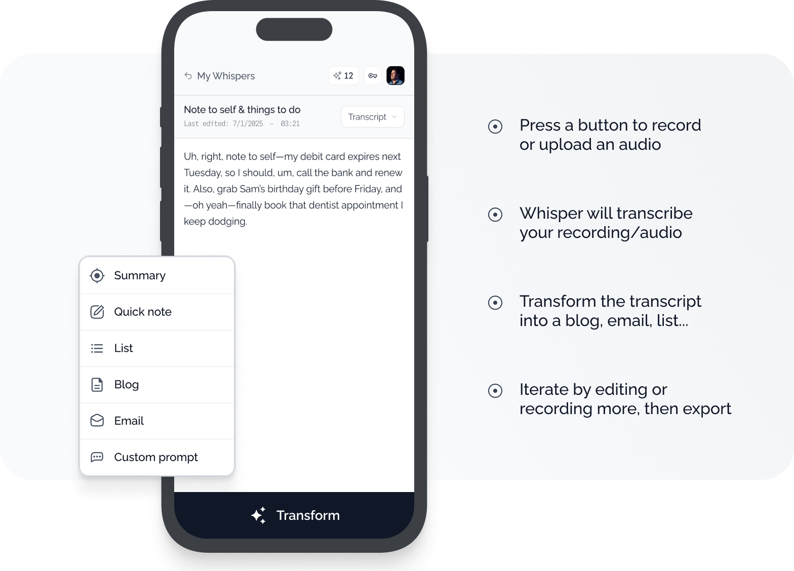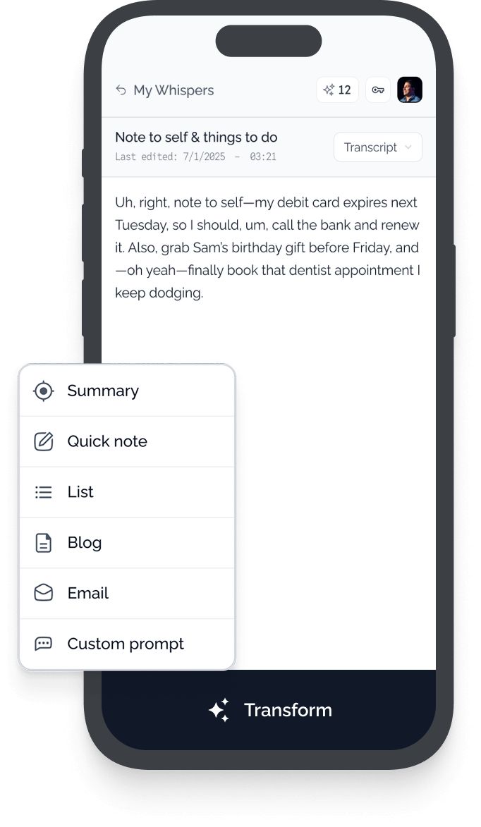 Transform your voice into organized text and insights. Our AI transcribes your speech instantly and cleans it up!